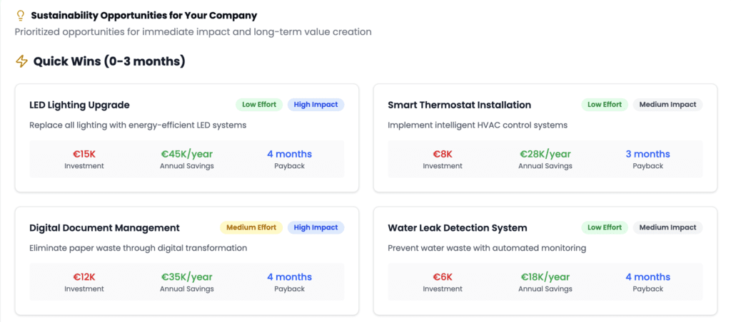 The platform uses AI-powered analysis to assess your current sustainability practices and identify key opportunities. It asks targeted questions about your business operations, analyzes your responses, and provides personalized recommendations that align with global sustainability standards and your specific industry requirements.