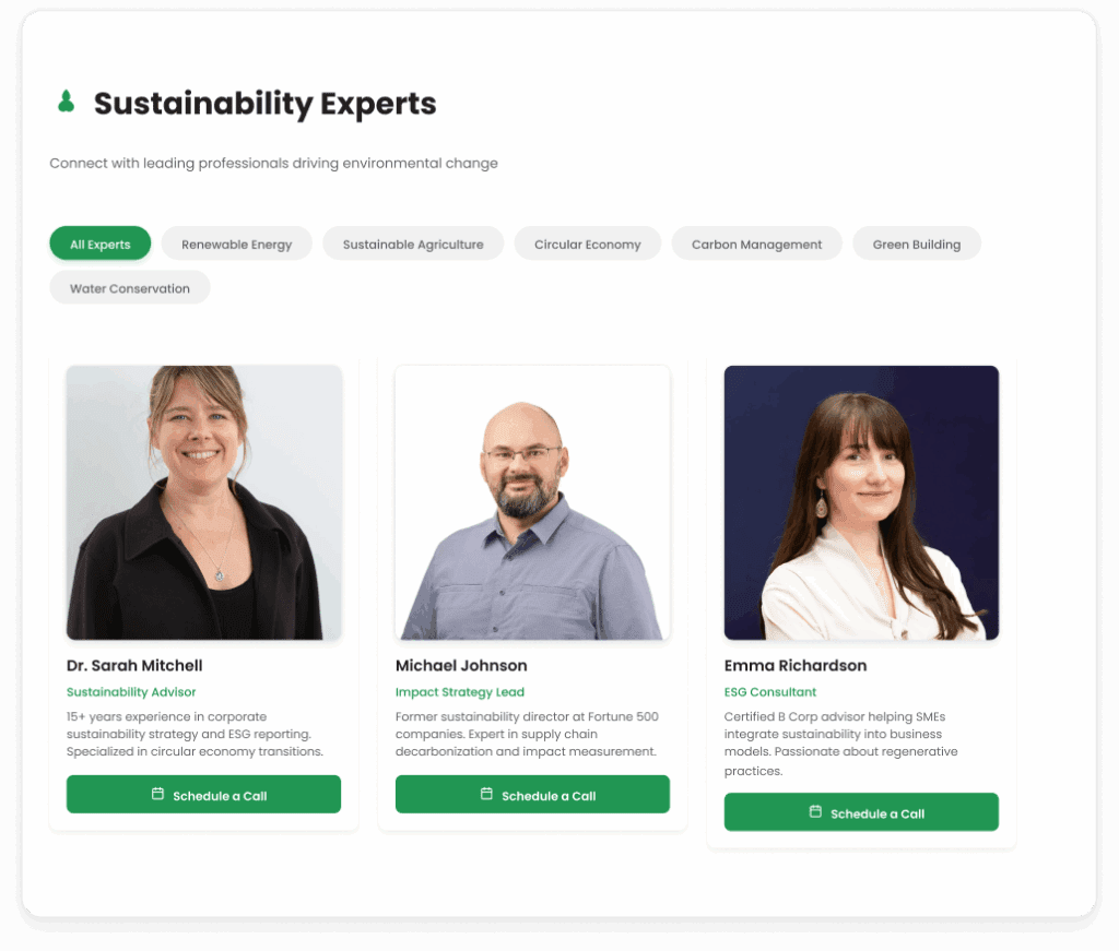 Our intelligence platform connects you with vetted expertise, our 250+ certified Impact Hub advisors and sustainability professionals to turn your goals into measurable results.